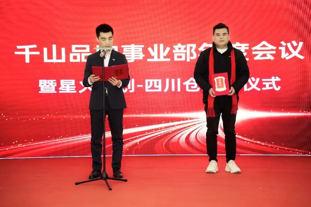 上午11點,直營倉啟動儀式正式開始,王總宣讀四川直營倉任命書:曹全震任千山品牌事業(yè)部四川直營倉總經(jīng)理,滿彬、閆志玉任千山品牌事業(yè)部四川直營倉大區(qū)經(jīng)理。