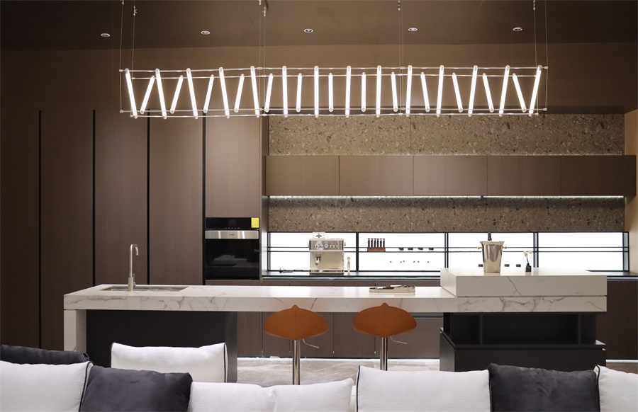 跟隨展廳動(dòng)線,來(lái)到了現(xiàn)代風(fēng)格的開(kāi)放餐廚展區(qū)。護(hù)墻板主體顏色為侘寂風(fēng)×朝陽(yáng)橙,采用18厘ENF級(jí)刨片板,展示柜采用意大利石紋×芬蘭玉石,營(yíng)造現(xiàn)代富有格調(diào)的空間氛圍。