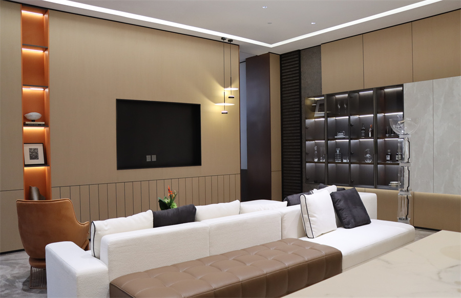 新中式與侘寂風(fēng)相結(jié)合,保留中式的獨(dú)特韻味。展示柜2109淺棕×故宮紅,增加了視覺(jué)上的深度和質(zhì)感。電視墻采用淺色石材紋理面板×夢(mèng)幻敦煌,增添穩(wěn)重質(zhì)感。