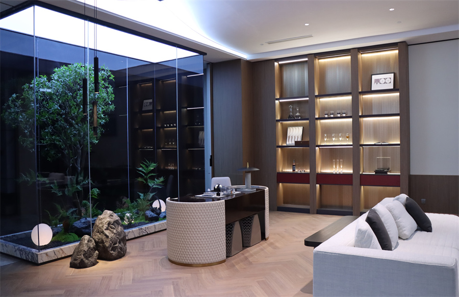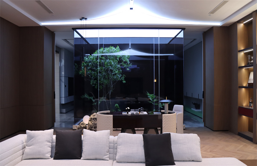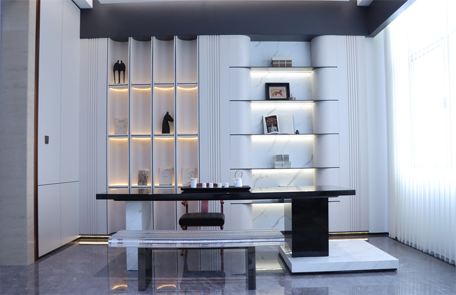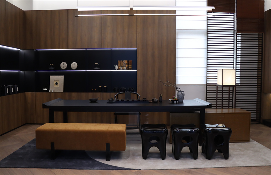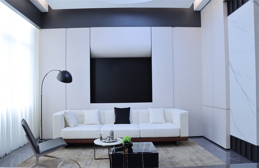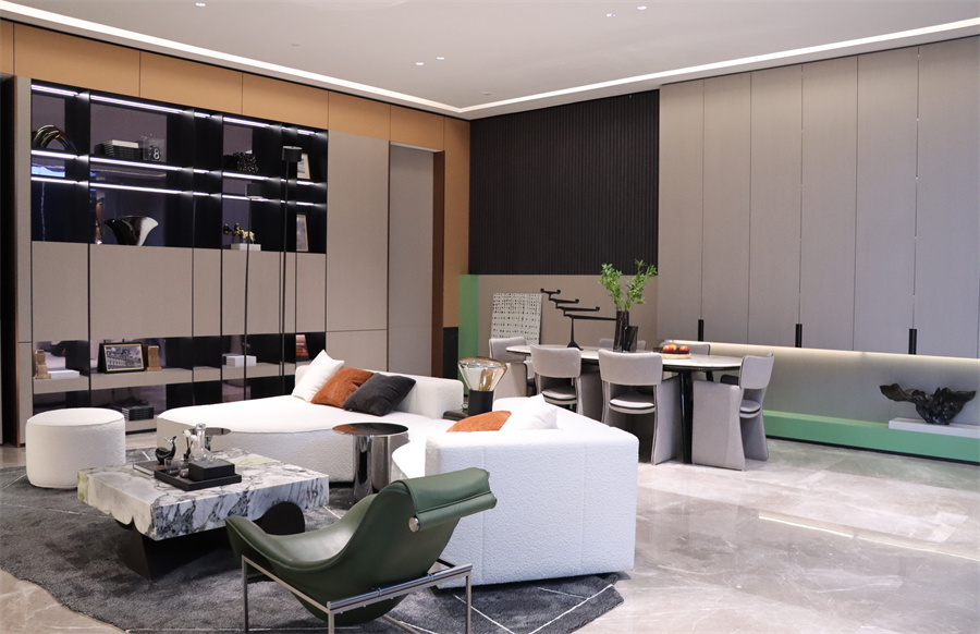 展廳五大空間呈現(xiàn)現(xiàn)代極簡(jiǎn)、現(xiàn)代輕奢、新中式三大主流家裝風(fēng)格,采用千山板材四大品類,糅合六大系列花色:木紋系列、純色系列、石紋系列、同步系列、數(shù)碼系列、PET系列,演繹多元化生活場(chǎng)景。