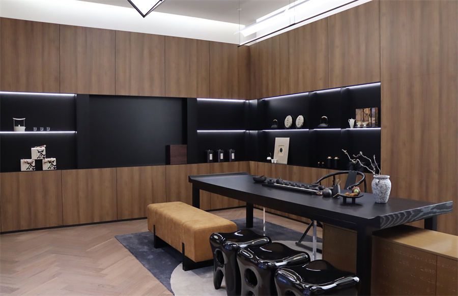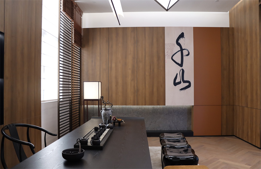新中式風(fēng)格茶室主體配色為門(mén)墻柜一體花色金色胡桃,其獨(dú)特木質(zhì)紋理營(yíng)造出自然質(zhì)樸之韻,與木質(zhì)護(hù)墻板與地板遙相呼應(yīng),兼具耐用性和溫暖質(zhì)感。