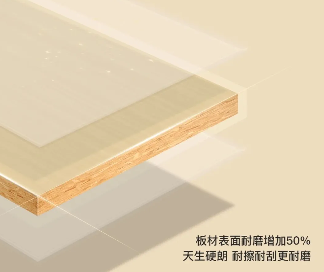 高密度離子晶體層有效分散外部壓力,吸收沖擊能量,從而顯著增強(qiáng)板材的垂直承載極限。20mm厚度,超出行業(yè)板材普遍厚度(18mm)10%,有效提升了板材的承重力,承重性能提升50%,輕松應(yīng)對大空間儲物承壓需求。